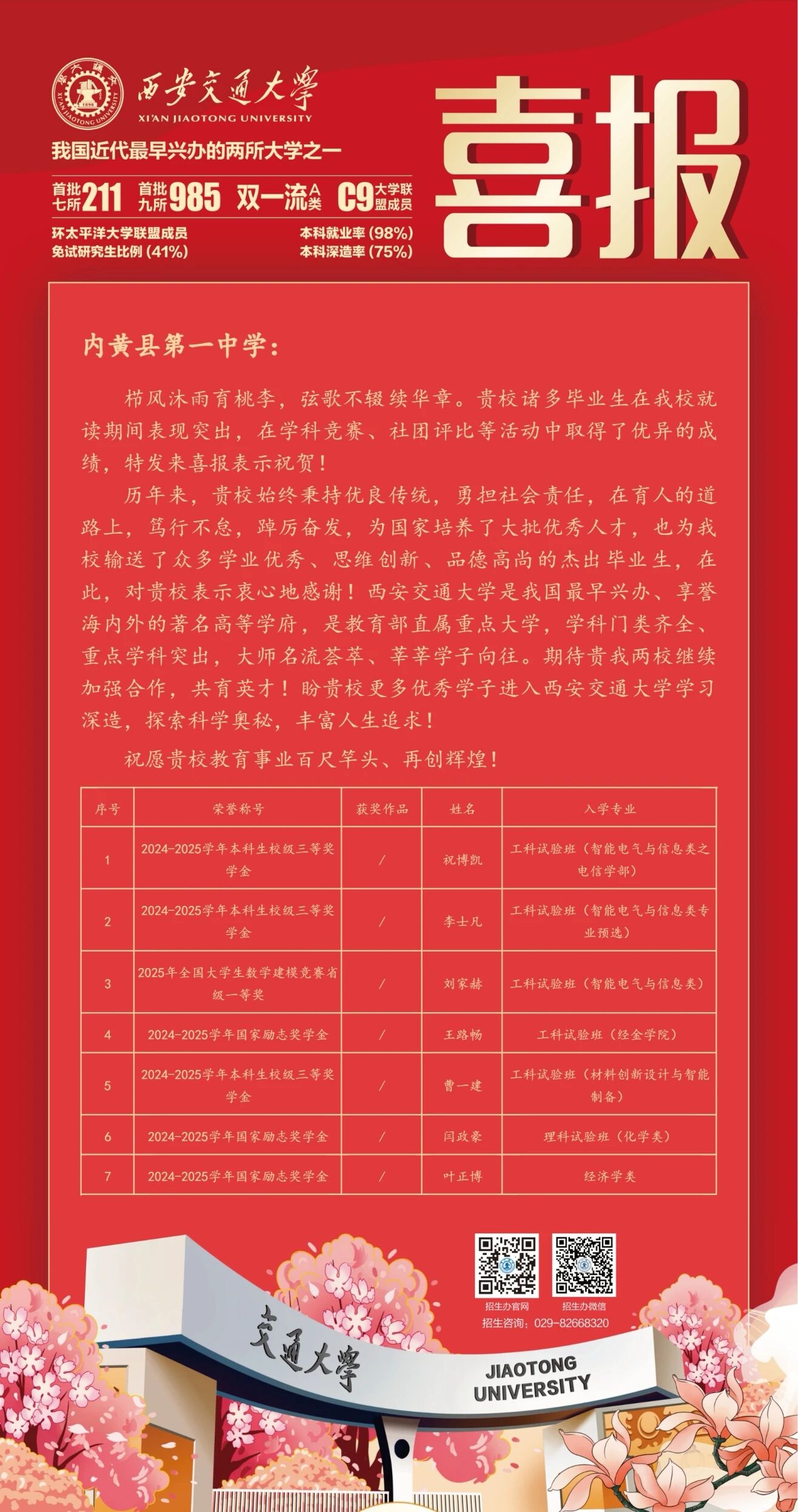 西安交通大学向内黄一中发来喜报 祝贺我校优秀毕业生再创佳绩