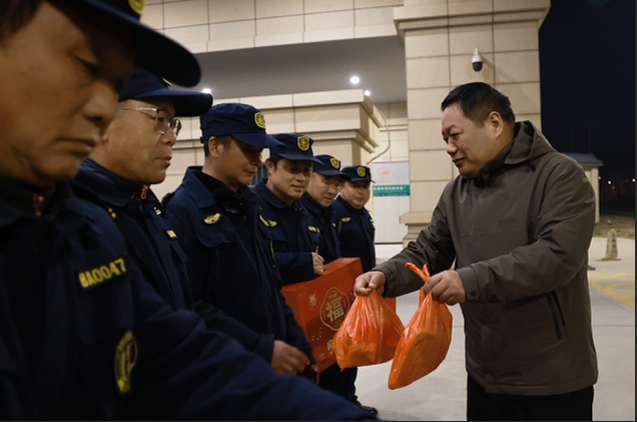 随后,杨刚雷将精心准备的慰问品送到每一位安保人员手中,这份暖心关怀不仅承载着学校对一线工作者的重视,更传递着节日的温暖。他反复叮嘱大家,在坚守岗位的同时,一定要做好自身防寒保暖,合理安排休息,保重身体健康,并代表学校向安保人员及其家人致以节日的问候和新年的美好祝福,感谢家人对工作的默默支持与理解,正是这份包容与坚守,让安保工作有了最坚实的后盾。
