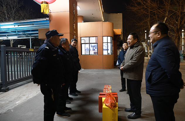 夜色中,校园门岗的灯光格外明亮,安保人员身着制服、精神抖擞,坚守在校园安全的第一道防线。每到一处,杨刚雷都与安保人员逐一握手,关切询问他们的值班安排、防寒保暖措施及安保设备运行等情况,并细致查看门岗登记流程与安保措施落实细节。他动情地说道:“除夕夜是阖家团圆的时刻,你们主动放下小家的团聚,坚守岗位守护校园平安,用敬业与担当为全校师生筑牢安全屏障,这份无私奉献的精神,值得所有人敬佩,学校由衷感谢你们的付出!”